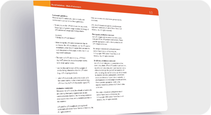 Brand Guidelines – Media Professionals 1.3 If the use includes the color brown, please use this Trademark guidelines When using UPS trademarks, service marks and statement: service names please follow these guidelines: UPS, the UPS brandmark and the color brown are • Do not play on the UPS initials or alter any marks. registered trademarks of United Parcel Service of These types of generic usage weaken the image of America, Inc. All rights reserved. UPS services as unique and distinguishable. Photography attribution statement Incorrect: Use UPS images only in connection with a news "Life has its UPS and downs." story on UPS or UPS products and services. Please provide appropriate credit to the reproduction of • When listing the UPS name in materials that do UPS images as follows: ® not feature the UPS brandmark, use the ( ) symbol immediately after the UPS name (first use only for This image is reproduced with permission of each document or Web page) to note that it is a United Parcel Service of America, Inc. registered trademark. © Copyright 2003 United Parcel Service of America, Inc. All rights reserved. • The names of UPS services (e.g., UPS Next Day Air®) should be treated as proper names, B-roll video attribution statement with initial capital letters. Use UPS B-roll video only in connection with a news story about UPS or UPS products and services. • Use the descriptive name of the category of Use of B-roll video must not in any way diminish or service being referred to after the UPS name otherwise damage the goodwill or reputation of (e.g., UPS shipping services). UPS, including, but not limited to, use which would be deemed obscene, pornographic, excessively • Label UPS trademarks and service marks with violent or otherwise in poor taste or unlawful, or the correct symbol in the correct position (e.g., which purpose is to encourage unlawful activities. ® SM Please provide appropriate credit to the UPS Next Day Air, UPS Worldwide Express ). reproduction of any portion of UPS B-roll video Attribution statements as follows: Whenever the UPS name, brandmark or trademarks are used by third-party organizations on any This video is broadcast with permission of communications material, the following statement United Parcel Service of America, Inc. must appear in a clear, easily readable position on © Copyright 2003 United Parcel Service of the material: America, Inc. All rights reserved. UPS and the UPS brandmark are registered trademarks of United Parcel Service of America, Inc. All rights reserved.