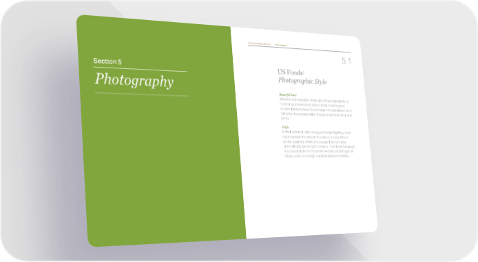 US FOODS® BRAND GUIDELINES CORPCOLOR & TORATE LYPEOGO US FOODS® BRAND GUIDELINES PHOTOGRAPHY 5.1 Section 5 ® US Foods Photography Photographic Style Beautiful Food Whether it be detailed close-ups of raw ingredients or steaming, prepared and plated food, food imagery should always inspire. Food images should always be in full color; food-preparation images may be in black and white. Chefs In their element, with energy and bright lighting, chefs move around the kitchen in a blur of activity. When photo-graphing chefs, encourage them to move authentically, ignoring the camera. Their body language is focused and in the moment. Present chef images in full airy color or as high-contrast black and whites.