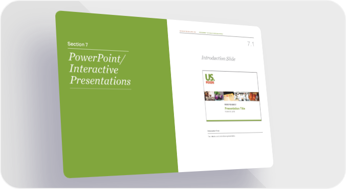 US FOODS® BRAND GUIDELINES CORPORATE LOGO US FOODS® BRAND GUIDELINES POWERPOINT / INTERACTIVE PRESENTATIONS 46 7.1 Section 7 PowerPoint/ Introduction Slide Interactive Presentations Introduction Slide This slide is used to introduce a presentation.