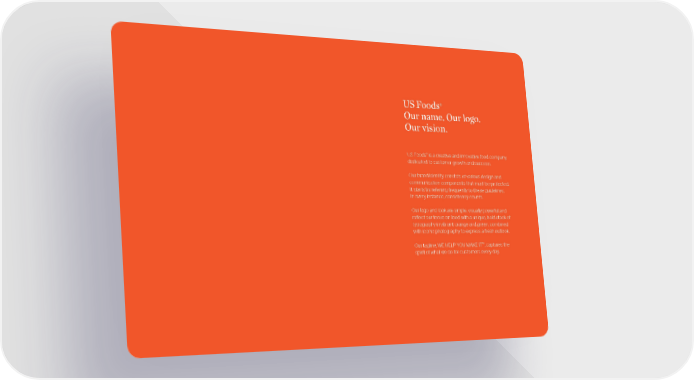 US FOODS® BRAND GUIDELINES CORPORATE LOGO ® US Foods Our name. Our logo. Our vision. ® US Foods is a creative and innovative food company, dedicated to customer growth and success. Our brand identity consists of various design and communication components that must be protected. It starts by referring frequently to these guidelines. In every instance, consistency counts. Our logo and look are simple, visually powerful and reflect our focus on food with a unique, bold stack of typography in vibrant orange and green, combined with iconic photography to express a fresh outlook. ™ Our tagline, WE HELP YOU MAKE IT , captures the spirit of what we do for customers every day.