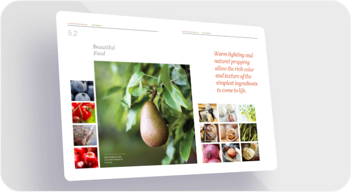 US FOODS® BRAND GUIDELINES PHOTOGRAPHY US FOODS® BRAND GUIDELINES PHOTOGRAPHY 5.2 Beautiful Warm lighting and Food natural propping allow the rich color and texture of the simplest ingredients to come to life. Allow ample quiet space around the focal point of the image.