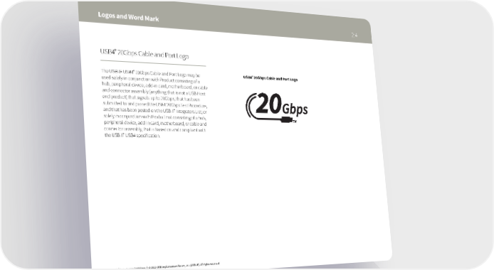 Logos and Word Mark 2:4 ® USB4 20Gbps Cable and Port Logo ® ® The USB-IF USB4 20Gbps Cable and Port Logo may be USB4 20Gbps Cable and Port Logo used solely in conjunction with Product consisting of a hub, peripheral device, add-in card, motherboard, or cable and connector assembly (anything that is not a USB Host end product) that signals up to 20Gbps, that has been submitted to and passed the USB4 20Gbps Test Procedure, and that has been posted on the USB-IF Integrators List; or solely in conjunction with Product not consisting of a hub, peripheral device, add-in card, motherboard, or cable and connector assembly, that is based on and compliant with the USB-IF USB4 specification. ® USB4 Logo Usage Guidelines | © 2022 USB Implementers Forum, Inc. (USB-IF). All rights reserved.