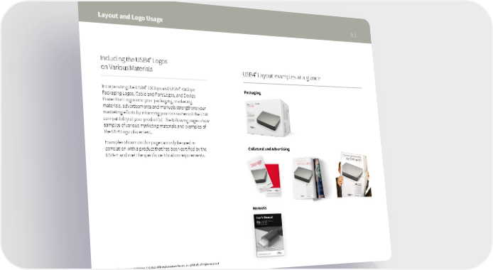 Layout and Logo Usage 6:1 ® Including the USB4 Logos on Various Materials ® USB4 Layout examples at a glance ® ® Incorporating the USB4 20Gbps and USB4 40Gbps Packaging Packaging Logos, Cable and Port Logos, and Device Power Port Logos into your packaging, marketing materials, advertisements and manuals strengthens your marketing efforts by informing your consumers of the USB compatibility of your product(s). The following pages show samples of various marketing materials and examples of the USB Logo placement. Examples shown on this page can only be used in correlation with a product that has been certified by the Collateral and Advertising USB-IF and met the specific certification requirements. Manuals ® USB4 Logo Usage Guidelines | © 2022 USB Implementers Forum, Inc. (USB-IF). All rights reserved.