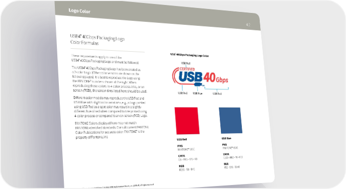 Logo Color 4:2 ® USB4 40Gbps Packaging Logo Color Formulas USB® 40Gbps Packaging Logo Color These requirements apply to use of the USB Red ® USB4 40Gbps Packaging Logo and must be followed. ® The USB4 40Gbps Packaging Logo has been created as a 2-color Logo. (Other color versions are shown on the following pages). It is best to reproduce the Logo using ® the PANTONE numbers shown at the right. When reproducing these colors in 4-color process inks, or on- screen (RGB), the screen tints listed here should be used. USB Red USB Blue USB Red Different color models may reproduce the USB Red and USB Blue with slight color variations, e.g., a Logo printed using USB Red as a spot color may result in a slightly different hue of red when compared to one printed using 4-color process or compared to an on-screen (RGB) Logo. PANTONE Colors displayed here may not match PANTONE-identified standards. Consult current PANTONE ® Color Publications for accurate color. PANTONE is the property of Pantone, Inc. USB Red USB Blue PMS PMS PANTONE® 185C PANTONE® 653C CMYK CMYK C0 - M91 - Y76 - K0 C100 - M62 - Y0 - K20 RGB RGB R235 - G0 - B41 R52 - G96 - B148 ® USB4 Logo Usage Guidelines | © 2022 USB Implementers Forum, Inc. (USB-IF). All rights reserved.