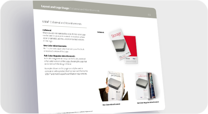 Layout and Logo Usage: Collateral and Advertisements 6:3 ® USB4 Collateral and Advertisements Collateral Collateral Where you are not restricted by color, the full-color Logo can be used for your print material. In situations where color is restricted, use the 1-color or reversed versions of the Logo. One-Color Advertisements For 1-color newspaper advertisements, use the black or reversed version of the Logo. Full-Color Magazine Advertisements Full-color magazine ads may use the 1-color, reversed or full-color versions of the Logo, choosing the Logo that works best with the design of the ad. Examples shown on this page can only be used in correlation with a product that has been certified by the USB-IF and met the specific certification requirements. One-Color Advertisement Full-Color Magazine Advertisement ® USB4 Logo Usage Guidelines | © 2022 USB Implementers Forum, Inc. (USB-IF). All rights reserved.