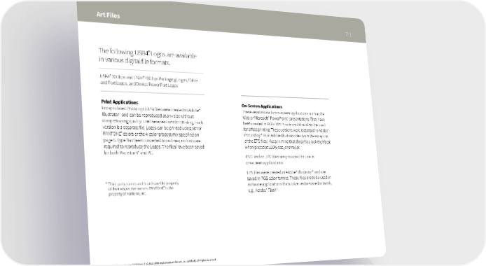 Art Files 7:1 ® The following USB4 Logos are available in various digital file formats. ® ® USB4 20Gbps and USB4 40Gbps Packaging Logos, Cable and Port Logos, and Device Power Port Logos Print Applications On-Screen Applications Encapsulated Postscript (EPS) files were created in Adobe* These versions are for on-screen applications such as the Illustrator* and can be reproduced at any size without Web or Microsoft* PowerPoint* presentations. They have compromising quality. Use these versions for printing. Each been created in RGB color mode and should not be used version is a separate file. Logos can be printed using either for offset printing. These versions were rasterized in Adobe* ® Photoshop* from Adobe Illustrator files (with the exception PANTONE colors or the 4-color process mix specified on page 6. Type has been converted to outlines; no fonts are of the EPS files). Keep in mind that these files look their best required to reproduce the Logos. The files have been saved when placed at 100% size, or smaller. for both Macintosh* and PC. PNG and or JPG files are provided for use in on-screen applications. EPS files were created in Adobe* Illustrator* and are * Third-party names and brands are the property saved in RGB color format. These files are to be used in of their respective owners. PANTONE® is the software applications that utilize vector-based artwork, property of Pantone, Inc. e.g., Adobe* Flash*. ® USB4 Logo Usage Guidelines | © 2022 USB Implementers Forum, Inc. (USB-IF). All rights reserved.