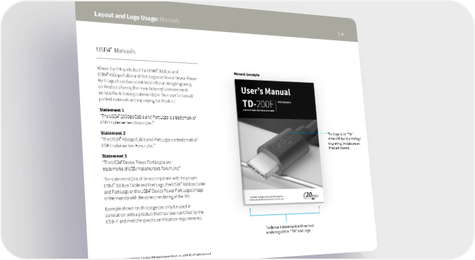 Layout and Logo Usage: Manuals 6:4 ® USB4 Manuals ® Manual Example Where the TM symbols of the USB4 20Gbps and ® USB4 40Gbps Cable and Port Logos or Device Device Power Port Logos have been omitted on the printing/engraving on Product chassis, the manufacturer/Licensees must include the following statement(s) in their user’s manual/ printed materials accompanying the Product: Statement 1 ® “The USB4 20Gbps Cable and Port Logo is a trademark of USB Implementers Forum, Inc.” Statement 2 The Logo with “TM” ® removed due to printing/ “The USB4 40Gbps Cable and Port Logo is a trademark of engraving limitations on USB Implementers Forum, Inc.” Product chassis Statement 3 ® “The USB4 Device Power Port Logos are trademarks of USB Implementers Forum, Inc.” The statement(s) must be accompanied with the proper ® ® USB4 20Gbps Cable and Port Logo, the USB4 40Gbps Cable ® and Port Logo or the USB4 Device Power Port Logos image of the mark(s) with the correct rendering of the TM. Example shown on this page can only be used in correlation with a product that has been certified by the USB-IF and met the specific certification requirements. Trademark statement with correct rendering of the “TM” and Logo ® USB4 Logo Usage Guidelines | © 2022 USB Implementers Forum, Inc. (USB-IF). All rights reserved.
