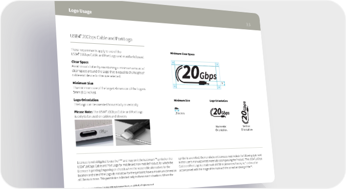 Logo Usage 3:3 ® USB4 20Gbps Cable and Port Logo These requirements apply to use of the Minimum Clear Space ® USB4 20Gbps Cable and Port Logo and must be followed. 1X 1X Clear Space Avoid visual clutter by maintaining a minimum amount of clear space around the Logo that is equal to the height of cable end device for the size selected. Minimum Size X 1X 1X The minimum size of the largest dimension of the Logo is 5mm (0.2 inches). Logo Orientation Minimum Size Logo Orientation The Logo can be oriented horizontally or vertically. ® Please Note: The USB4 20Gbps Cable and Port Logo .2 inches is only to be used on cables and devices. Horizontal Vertical Orientation Orientation Licensee is not obligated to use the “™” and may omit the trademark ™ symbol on the symbol is so omitted, the manufacturer/Licensees must include the following statement ® ® USB4 20Gbps Cable and Port Logo for mobile and non-mobile Product, for which the in their user’s manual/printed materials accompanying the Product: “The USB4 20Gbps Licensee is printing/engraving on chassis where the reasonable alternatives for the Cable and Port Logo is a trademark of USB Implementers Forum, Inc.” and must be location and size of the Logo do not allow for the symbol to have a maximum dimension accompanied with the image of the mark with the correct rendering of the ™. of 15mm or more. This permission is limited only to these exact situations. Where the ® USB4 Logo Usage Guidelines | © 2022 USB Implementers Forum, Inc. (USB-IF). All rights reserved.