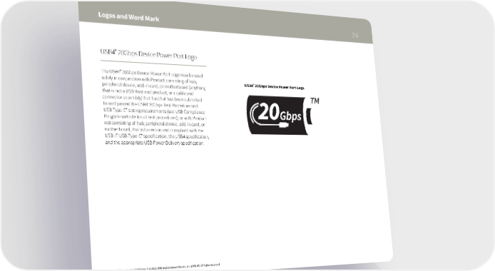 Logos and Word Mark 2:6 ® USB4 20Gbps Device Power Port Logo ® The USB4 20Gbps Device Power Port Logo may be used solely in conjunction with Product consisting of hub, ® peripheral device, add-in card, or motherboard (anything USB4 20Gbps Device Power Port Logo that is not a USB Host end product, or a cable and connector assembly) that has that has been submitted to and passed the USB4 20Gbps Test Procedure and ® USB Type-C testing requirements (see USB Compliance Program website for all test procedures); or with Product not consisting of hub, peripheral device, add-in card, or motherboard, that is based on and compliant with the ® USB-IF USB Type-C specification, the USB4 specification, and the appropriate USB Power Delivery specification. ® USB4 Logo Usage Guidelines | © 2022 USB Implementers Forum, Inc. (USB-IF). All rights reserved.