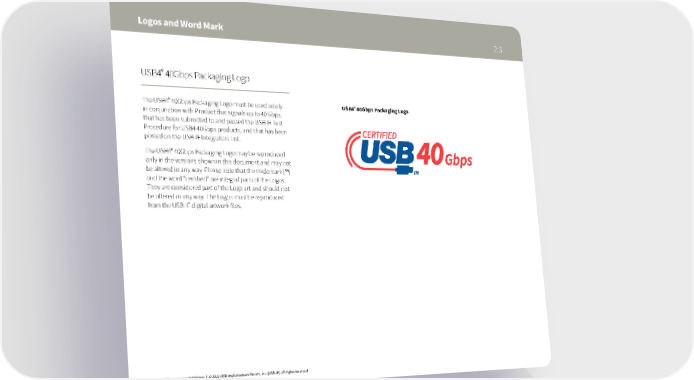Logos and Word Mark 2:3 ® USB4 40Gbps Packaging Logo ® ® The USB4 40Gbps Packaging Logo must be used solely USB4 40Gbps Packaging Logo in conjunction with Product that signals up to 40 Gbps, that has been submitted to and passed the USB-IF Test Procedure for USB4 40Gbps products, and that has been posted on the USB-IF Integrators List. ® The USB4 40Gbps Packaging Logo may be reproduced only in the versions shown in this document and may not be altered in any way. Please note that the trademark (™) and the word “certified” are integral parts of the Logos. They are considered part of the Logo art and should not be altered in any way. The Logos must be reproduced from the USB-IF digital artwork files. ® USB4 Logo Usage Guidelines | © 2022 USB Implementers Forum, Inc. (USB-IF). All rights reserved.
