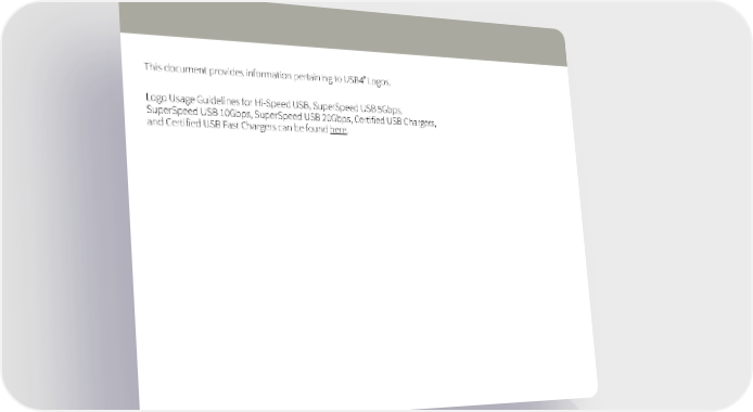 ® This document provides information pertaining to USB4 Logos. Logo Usage Guidelines for Hi-Speed USB, SuperSpeed USB 5Gbps, SuperSpeed USB 10Gbps, SuperSpeed USB 20Gbps, Certified USB Chargers, and Certified USB Fast Chargers can be found here.