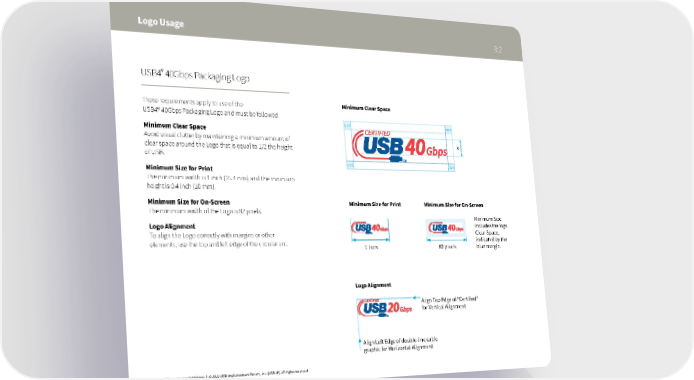 Logo Usage 3:2 ® USB4 40Gbps Packaging Logo These requirements apply to use of the Minimum Clear Space USB4® 40Gbps Packaging Logo and must be followed. 1/2 X 1/2 X Minimum Clear Space Avoid visual clutter by maintaining a minimum amount of X clear space around the Logo that is equal to 1/2 the height of USB. 1/2 X 1/2 X Minimum Size for Print The minimum width is 1 inch (25.4 mm) and the minimum height is 0.4 inch (10 mm). Minimum Size for On-Screen Minimum Size for Print Minimum Size for On-Screen The minimum width of the Logo is 82 pixels. Minimum Size Logo Alignment includes the logo To align the Logo correctly with margins or other Clear Space, elements, use the top and left edge of the circular arc. indicated by the 1 inch 82 pixels blue margin. Logo Alignment Align Top Edge of “Certified” for Vertical Alignment Align Left Edge of double-line cable graphic for Horizontal Alignment ® USB4 Logo Usage Guidelines | © 2022 USB Implementers Forum, Inc. (USB-IF). All rights reserved.