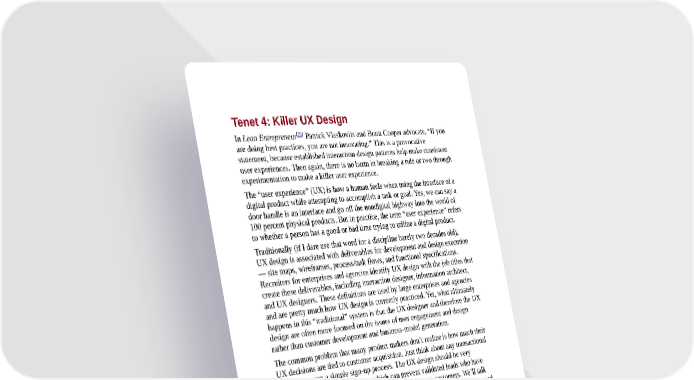 Tenet 4: Killer UX Design [23] In Lean Entrepreneur Patrick Vlaskovits and Brant Cooper advocate, “If you are doing best practices, you are not innovating.” This is a provocative statement, because established interaction design patterns help make consistent user experiences. Then again, there is no harm in breaking a rule or two through experimentation to make a killer user experience. The “user experience” (UX) is how a human feels when using the interface of a digital product while attempting to accomplish a task or goal. Yes, we can say a door handle is an interface and go off the nondigital highway into the world of 100 percent physical products. But in practice, the term “user experience” refers to whether a person has a good or bad time trying to utilize a digital product. Traditionally (if I dare use that word for a discipline barely two decades old), UX design is associated with deliverables for development and design execution — site maps, wireframes, process/task flows, and functional specifications. Recruiters for enterprises and agencies identify UX design with the job titles that create these deliverables, including interaction designer, information architect, and UX designers. These definitions are used by large enterprises and agencies and are pretty much how UX design is currently practiced. Yet, what ultimately happens in this “traditional” system is that the UX designer and therefore the UX design are often more focused on the issues of user engagement and design rather than customer development and business-model generation. The common problem that many product makers don’t realize is how much their UX decisions are tied to customer acquisition. Just think about any transactional website or even a simple sign-up process. The UX design should be very concerned with barriers to entry, which can prevent validated leads who have previously engaged with the product from converting to customers. We’ll talk more about this in Chapter 9. Interfaces and user flows should be geared toward the desired response of the user. It’s all about engagement. This is what distinguishes a novice UX designer from a killer UX designer. Killer UX designers know now to guide the value innovation of a product in the following ways: They work collaboratively with stakeholders and teammates at the idea’s inception. Then, the UX designer can be involved in designing structured experiments for validation. These experiments need to be focused on how successful the value proposition can be communicated to the customer from