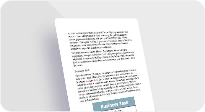 account, to clicking the “Place your order” button. If your product’s revenue stream is from selling banner or video advertising, the goal is to make the content pages more compelling with plenty of “Read More” links to keep customers clicking and swiping. If you want to increase the Time on Site (ToS), you probably want plenty of related onsite articles to keep users bouncing around your pages like an endless game of pinball. The desired response can be different depending on the user’s level of engagement. A suspect just needs to have a positive experience, but a Customer might need to respond by clicking a Submit or Buy button. Think on a granular level about the shortest path of required actions to get your users happily down the funnel. Business Task Now take off your UX strategy hat and put on your marketing cap. It’s time to look at the Funnel Matrix from the standpoint of your business goals, as illustrated in Figure 9-10. This is where you need to address what must happen behind the scenes to enable the user’s process. This includes both tried-and-true online advertising campaigns and new forms of growth hacking. The basic concept is to build marketing organically into the product, as opposed to piling it on top of the completed product and then tying it back with metrics. This is absolutely critical to the UX strategy. Business strategy and interaction design must go hand-in-hand. Figure 9-10. Business Task cell in the TradeYa Funnel Matrix Thus, the business task at the Suspect stage for you and your team is to find new channels and try lots of experiments to reach your potential customers and grab their attention. This requires consideration of the different touch points and contexts in which users might discover your product — on Facebook, on their