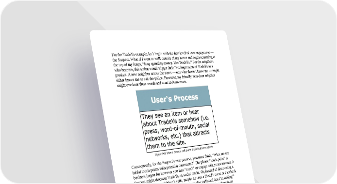 For the TradeYa example, let’s begin with the first level of user engagement — the Suspect. What if I were to walk outside of my house and begin screaming at the top of my lungs, “Stop spending money. Use TradeYa!” For the neighbors who hear me, this action would trigger their first impression of TradeYa as a product. A new neighbor across the street — one who doesn’t know me — might either ignore me or call the police. However, my friendly next-door neighbor might overhear these words and want to learn more. Figure 9-8. User’s Process cell in the TradeYa Funnel Matrix Consequently, for the Suspect’s user process, you must think, “What are my initial touch points with potential customers?” The phrase “touch point” is business jargon for however you first “touch” or engage with your customer. A Suspect might discover TradeYa on social media. Or, instead of discovering a product through a neighbor’s yells, maybe he sees a friend’s tweet or Facebook post with a shared TradeYa link: “Check out this surfboard that I’m trading!” Suspects also might discover TradeYa or a TradeYa item listing through an organic search. Ultimately, what should go in this column cell is what your team thinks are the most likely ways users will initially discover the product. These “ways” are your sales channels and tactics for acquiring customers. Discover, explore, and experiment with all of them. Desired Action The Desired Action for the Funnel Matrix (see Figure 9-9) is what you hope users do in response to the “process” they just experienced. It is the action that
