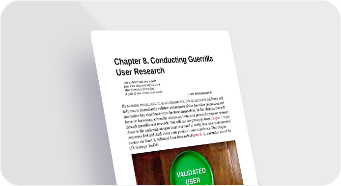 Chapter 8. Conducting Guerrilla User Research Take a chance and step outside. Lose some sleep and say you tried. Meet frustration face to face. A point of view creates more waves. — JOY DIVISION (1979) BY RUNNING SMALL, STRUCTURED EXPERIMENTS, THIS QUALITATIVE fieldwork will help you to immediately validate assumptions about the value proposition and innovative key experience from the users themselves. In this chapter, you will focus on harvesting actionable takeaways from your potential customer segment through guerrilla user research. You will use the prototype from Chapter 7 to get closer to the truth with an open heart and mind to really hear what your potential customers feel and think about your product’s core experience. This chapter focuses on Tenet 3, Validated User Research (Figure 8-1), and makes use of the UX Strategy Toolkit. Figure 8-1. Tenet 3: Validated User Research