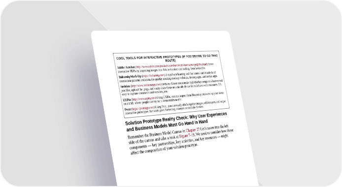 COOL TOOLS FOR INTERACTIVE PROTOTYPES (IF YOU DECIDE TO GO THAT ROUTE) Adobe Acrobat (http://www.adobe.com/products/acrobat/create-interactive-pdf-files.html) Create interactive PDFs by importing images into Adobe Acrobat and making them interactive. Balsamiq Mock-Up (https://balsamiq.com) A rapid wireframing tool that comes with hundreds of interaction patterns and icons for quickly creating mockup websites, desktop apps, and mobile apps. Invision (http://www.invisionapp.com) Invision allows you to make high-fidelity comps in whatever tool you like, upload the .pngs, and easily share them on a mobile device for validation with customers. It’s easy to capture comments and versions, too. UXPin (http://www.uxpin.com) Using UXPin, you can import from Photoshop and serve up your demo on a URL where people can try out a demonstration of it. Prott (https://prottapp.com) Using Prott, you can easily stitch together images, add hotspots, and output interactive prototypes that work great for testing concepts on multiple devices. Solution Prototype Reality Check: Why User Experiences and Business Models Must Go Hand in Hand Remember the Business Model Canvas in Chapter 2? Let’s zoom into the left side of the canvas and take a look at Figure 7-19. We need to consider how those components — key partnerships, key activities, and key resources — might affect the composition of your solution prototype.