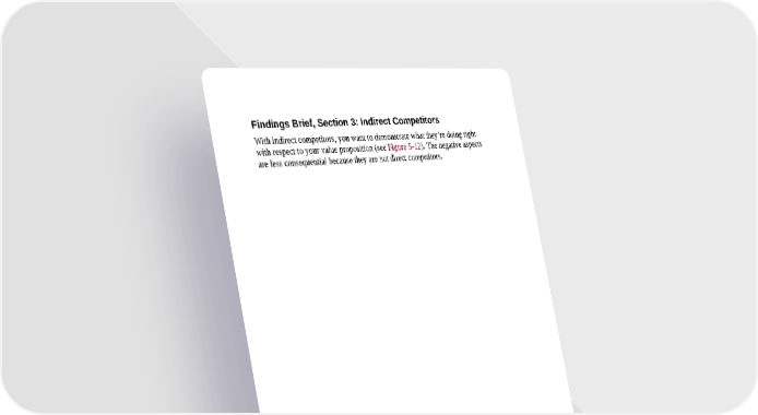 Findings Brief, Section 3: Indirect Competitors With indirect competitors, you want to demonstrate what they’re doing right with respect to your value proposition (see Figure 5-12). The negative aspects are less consequential because they are not direct competitors.