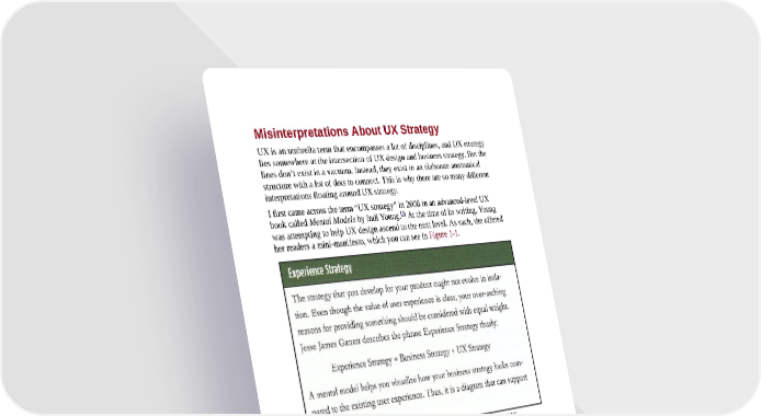 Misinterpretations About UX Strategy UX is an umbrella term that encompasses a lot of disciplines, and UX strategy lies somewhere at the intersection of UX design and business strategy. But the lines don’t exist in a vacuum. Instead, they exist in an elaborate anatomical structure with a lot of dots to connect. This is why there are so many different interpretations floating around UX strategy. I first came across the term “UX strategy” in 2008 in an advanced-level UX [3] book called Mental Models by Indi Young. At the time of its writing, Young was attempting to help UX design ascend to the next level. As such, she offered her readers a mini-manifesto, which you can see in Figure 1-1. Figure 1-1. Sidebar from the book Mental Models © 2008 Rosenfeld Media, LLC I really wanted to understand what UX strategy meant, but aside from the fact that the difference between “experience” strategy and “user experience” strategy just seems to be one word, the book didn’t delve any deeper into this abstract equation. Over the course of my career from working with big interactive agencies to enterprises, I’ve heard many other theoretical concepts about the intention of UX strategy. And that’s something I want to sidestep in this book: the entirely semantic disputes about what “strategy” means or whether a theoretical framework has practical application. It’s important that we avoid battles that boil down to these kinds of debates. They only confuse our clients
