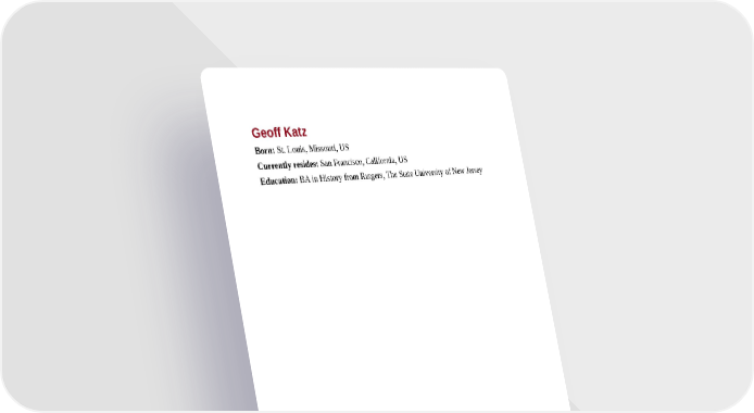 Geoff Katz Born: St. Louis, Missouri, US Currently resides: San Francisco, California, US Education: BA in History from Rutgers, The State University of New Jersey