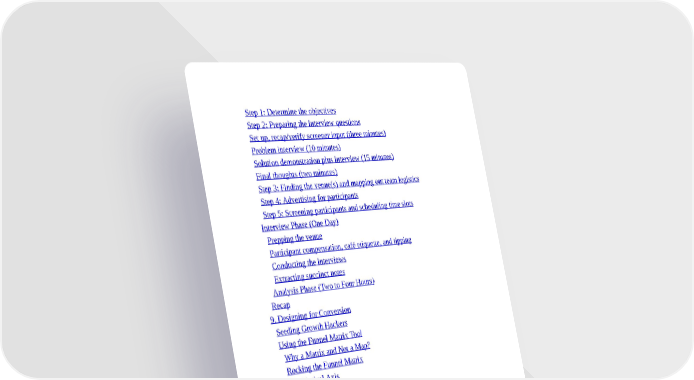 Step 1: Determine the objectives Step 2: Preparing the interview questions Set up, recap/verify screener input (three minutes) Problem interview (10 minutes) Solution demonstration plus interview (15 minutes) Final thoughts (two minutes) Step 3: Finding the venue(s) and mapping out team logistics Step 4: Advertising for participants Step 5: Screening participants and scheduling time slots Interview Phase (One Day) Prepping the venue Participant compensation, café etiquette, and tipping Conducting the interviews Extracting succinct notes Analysis Phase (Two to Four Hours) Recap 9. Designing for Conversion Seeding Growth Hackers Using the Funnel Matrix Tool Why a Matrix and Not a Map? Rocking the Funnel Matrix The Vertical Axis Suspect stage Lead stage Prospect stage Customer stage Repeat User stage Reference User stage The Horizontal Axis User’s Process Desired Action Business Task