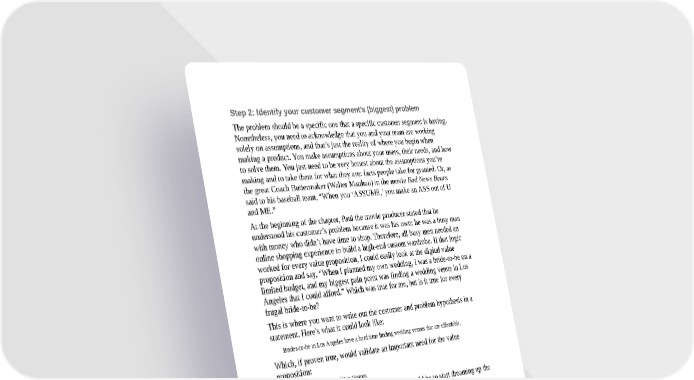 Step 2: Identify your customer segment’s (biggest) problem The problem should be a specific one that a specific customer segment is having. Nonetheless, you need to acknowledge that you and your team are working solely on assumptions, and that’s just the reality of where you begin when making a product. You make assumptions about your users, their needs, and how to solve them. You just need to be very honest about the assumptions you’re making and to take them for what they are: facts people take for granted. Or, as the great Coach Buttermaker (Walter Matthau) in the movie Bad News Bears said to his baseball team, “When you ‘ASSUME,’ you make an ASS out of U and ME.” At the beginning of the chapter, Paul the movie producer stated that he understood his customer’s problem because it was his own: he was a busy man with money who didn’t have time to shop. Therefore, all busy men needed an online shopping experience to build a high-end custom wardrobe. If that logic worked for every value proposition, I could easily look at the digital value proposition and say, “When I planned my own wedding, I was a bride-to-be on a limited budget, and my biggest pain point was finding a wedding venue in Los Angeles that I could afford.” Which was true for me, but is it true for every frugal bride-to-be? This is where you want to write out the customer and problem hypothesis in a statement. Here’s what it could look like: Brides-to-be in Los Angeles have a hard time finding wedding venues that are affordable. Which, if proven true, would validate an important need for the value proposition: Airbnb for Finding Wedding Venues. It would seem, then, that the next logical step would be to start dreaming up the entire feature set for this much-needed solution, right? No. Not yet. Remember the software engineer from Chapter 1? He jumped straight into building out the solution for his startup. He assumed that customers like him (addicts’ loved ones) would be interested in a digital platform with which they could negotiate prices with treatment centers. He also assumed that there would be a lot of customers like this or at least enough to help keep the business model afloat. Yet, these assumptions were just that: assumptions. He could not pinpoint the reason why his product was unsuccessful until my team ran validated user- research experiments. The experiments exposed the fallacy to him, which was that customers, including those with a decent budget, were highly unlikely to