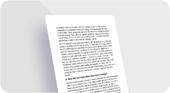 In an ideal world you wouldn’t need UX strategy, because it would just be a component of your product or business strategy. We’re moving into this ideal world, I think. We’re seeing more and more often that UX is considered a part of a broader strategy. But, I think the separate and distinct concept of UX strategy was necessary for us — at least so we could focus on it — to shine a light on it and develop a toolkit to then wrap up in product strategy. So, “UX strategy” is not bogus or overblown, but I do think that it’s a temporary artifact or a moment in time that we are in. If I think what UX strategy means to me, it is addressing those questions you need to answer and the answers to those questions that help inform your design. It’s not sufficient to simply have a business strategy or product strategy in the classical way of understanding your audience or total addressable market. You need to have a deeper understanding of your users, audiences, customers — whatever you want to call them — who they are, what they want, how they behave, and what they’re looking for. Traditional strategy methods, even if they talked about customers, didn’t really embrace deep customer understanding and empathy. So I think, what UX strategy does is it goes deeper into customer understanding. Again, what we’re seeing develop is a business strategy that is starting to appreciate that more directly. 3. How did you learn about business strategy? I had no formal training or business strategy education. But something happened while I was at Adaptive Path. I was trying to understand how to do better UX design just after the dot-com bust happened. It was 2002 and there was a lot of soul searching going on in the UX community about proving our value. A common theme that we felt we needed to prove was the Return On Investment (ROI) of user experience. One of the opportunities we had at Adaptive Path was to explore these types of questions. I started digging into MBA-ish literature and then we got into contact with a professor at Berkeley’s Haas School of Business, Sara L. Beckman (PhD, Industrial Engineering and Engineering Management, Stanford University). She was one of first people who were trying to understand that design provides an interesting categorical advantage within business. One of her MBA students, Scott Hirsch, partnered with Adaptive Path to write a business paper on business value and how ROI drives user experience. With their advisement, we attempted to apply some real business thinking to our UX process. And so it was through these kinds of exposures that I was able to learn about business strategy and the kinds of things businesses tend to care about.