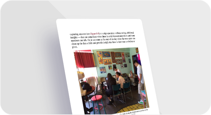 capturing answers (see Figure 8-8) to script questions without noting additional insights — that can come later when there is a lull between interviews and team members can talk. Or, it can come at the end of the day when the note-taker can clean up the data a little and provide insight into how to fine-tune a solution or pivot. Figure 8-8. Team members Bita (middle) and Ena (far right) during the Solution demo portion of the interview at a Culver City café. Participant on the left. During or after the interviews, the note-taker or you can also color code the spreadsheet to help make the analysis quicker (just as in Chapter 5 when you analyzed the competition.) A major pain point would be color-coded red. If a key experience or product concept received an easily fixable response, the note-taker could color-code it green. Feel free to develop your own system. Analysis Phase (Two to Four Hours) As I described at the beginning of the chapter, my team and the software engineer didn’t need to analyze our findings after the guerrilla user research. It