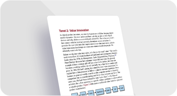 Tenet 2: Value Innovation As digital product inventors, we must be hyperaware of all the changing digital market dynamics. We must understand how and why people use their digital devices and what defines a successful and a failed UX. This is because a user’s first contact with the interface generally determines success or failure. It provides the user with their first impression of your value innovation, and it is value innovation that disrupts or creates new mental models for people. We definitely want to do that. Before we dig into value innovation, let’s discuss the word “value.” The word is used everywhere. It’s found in almost all traditional and contemporary business [15] books since the 1970s. In Management: Tasks, Responsibilities, Practices, Peter Drucker discusses how customer values shift over time. He gives an example of how a teenage girl will buy a shoe for its fashion, but when she becomes a working mother, she will probably buy a shoe for its comfort and price. In 1984, Michael Lanning first coined the term “value proposition” to explain how a firm proposes to deliver a valuable customer experience. For a business to generate wealth, it needs to offer a superior product to that of its competitors but at a manufacturing cost below what customers pay for it. That same year, Michael Porter defined the term “value chain” as the chain of activities that a firm operating in a specific industry performs in order to deliver a valuable product. Figure 2-4 illustrates a traditional value chain for a physical product manufacturer. Figure 2-4. The value chain That is the business process that Toyota uses to make vehicles and that Apple uses to make computers and devices. During each of the activities in this value chain of events, opportunities exist for firms to outperform their competitors. But, all those terms apply to physical products. By contrast, virtual products allow for a value chain to have faster repeat loops and in some cases for the activities to happen in parallel. This is part of why traditional business-strategy principles do not perfectly map to digital product strategy. When producing digital products, we must continuously research, redesign, and remarket to keep up with the rapidly evolving online marketplace, customer values, and value chains that are required to keep our products in production.