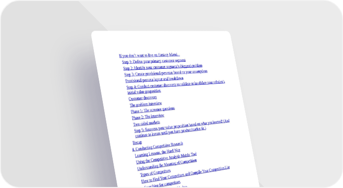 If you don’t want to live on Fantasy Island... Step 1: Define your primary customer segment Step 2: Identify your customer segment’s (biggest) problem Step 3: Create provisional personas based on your assumptions Provisional persona layout and breakdown Step 4: Conduct customer discovery to validate or invalidate your solution’s initial value proposition Customer discovery The problem interview Phase 1: The screener questions Phase 2: The interview Two-sided markets Step 5: Reassess your value proposition based on what you learned! (And continue to iterate until you have product/market fit.) Recap 4. Conducting Competitive Research Learning Lessons, the Hard Way Using the Competitive Analysis Matrix Tool Understanding the Meaning of Competition Types of Competitors How to Find Your Competitors and Compile Your Competition List Searching for competitors Filling Out the matrix with data URL of website or app store location Usernames and password access Purpose of site Year founded Funding rounds Revenue streams Monthly traffic # of SKUs/listings Primary categories