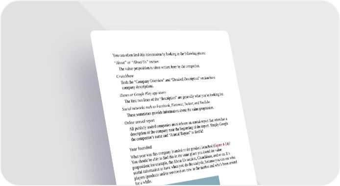 You can often find this information by looking in the following places: “About” or “About Us” section The value proposition is often written here by the competitor. Crunchbase Both the “Company Overview” and “Detailed Description” section have company descriptions. iTunes or Google Play app stores The first two lines of the “description” are generally what you’re looking for. Social networks such as Facebook, Pinterest, Twitter, and YouTube These sometimes provide information about the value proposition. Online annual report All publicly traded companies must release an annual report that often has a description of the company near the beginning of the report. Simply Google the competitor’s name and “Annual Report” to find it! Year founded What year was this company founded or the product launched (Figure 4-14)? You should be able to find this in the same place you found the value proposition; for example, the About Us section, Crunchbase, and so on. It’s useful information to have when you do the analysis, because you can see what players (products and/or services) are new to the market and who’s been around for a while. Figure 4-14. Year Founded result sample