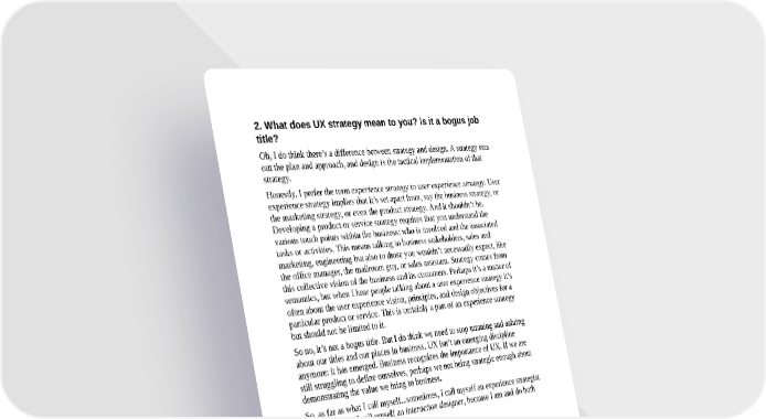 2. What does UX strategy mean to you? Is it a bogus job title? Oh, I do think there’s a difference between strategy and design. A strategy sets out the plan and approach, and design is the tactical implementation of that strategy. Honestly, I prefer the term experience strategy to user experience strategy. User experience strategy implies that it’s set apart from, say the business strategy, or the marketing strategy, or even the product strategy. And it shouldn’t be. Developing a product or service strategy requires that you understand the various touch points within the business: who is involved and the associated tasks or activities. This means talking to business stakeholders, sales and marketing, engineering but also to those you wouldn’t necessarily expect, like the office manager, the mailroom guy, or sales assistant. Strategy comes from this collective vision of the business and its customers. Perhaps it’s a matter of semantics, but when I hear people talking about a user experience strategy it’s often about the user experience vision, principles, and design objectives for a particular product or service. This is certainly a part of an experience strategy but should not be limited to it. So no, it’s not a bogus title. But I do think we need to stop umming and aahring about our titles and our places in business. UX isn’t an emerging discipline anymore: it has emerged. Business recognizes the importance of UX. If we are still struggling to define ourselves, perhaps we not being strategic enough about demonstrating the value we bring to business. So, as far as what I call myself...sometimes, I call myself an experience strategist and sometimes I call myself an interaction designer, because I am and do both of these things. 3. How did you learn about business strategy? I have no formal training. I learned the fundamentals of business strategy on the job, over the years. I understood fairly quickly that to be successful I had to have a really good grasp of an organization’s business model and strategy, not just its customers or end users. I wasn’t simply the voice of the customer, although that was my role when I was starting out. For the longest time, UX was in its own department, usually off somewhere with visual design. Technology sat somewhere else, as did the business folks. There were few integrated teams, so we were designing in a bubble. How can you possibly design a solution for a business if you have no understanding of what
