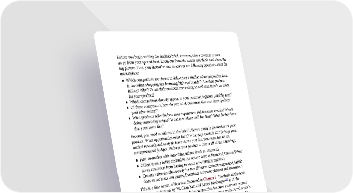 Before you begin writing the findings brief, however, take a moment to step away from your spreadsheet. Zoom out from the details and think hard about the big picture. First, you should be able to answer the following questions about the marketplace: Which competitors are closest to delivering a similar value proposition (that is, an online shopping site featuring high-end brands)? Are their products failing? Why? Or are their products succeeding so well that there’s no room for your product? Which competitors directly appeal to your customer segment (wealthy men)? Of those competitors, how do you think customers discover them (perhaps paid advertising)? What products offer the best user experiences and business models? Who is doing something unique? What is working well for them? What do they have that your users like? Second, you need to address in the brief if there’s room in the market for your product. What opportunities exist for it? What gaps could it fill? Perhaps your market research and analysis have shown you that your team has hit the entrepreneurial jackpot. Perhaps your product is one or all of the following: First-to-market with something unique (such as Pinterest) Offers users a better method to use or save time or finances (Amazon Prime saves customers from having to waste time running errands.) Creates value simultaneously for two different customer segments (Airbnb does so for hosts and guests; Eventbrite for event planners and attendees.) This is a blue ocean, which was discussed in Chapter 2. The thesis of the book [39] Blue Ocean Strategy by W. Chan Kim and Renée Mauborgne is of the uncontested marketplace in which the competition becomes irrelevant because there is none. A blue ocean is full of customers with unmet needs. A red ocean is a market full of sharks fighting for the fish. In writing your brief, you must be able to say with certainty whether your product is in a blue, red, or somewhere- in-between purple ocean (such as the lovely vista in Figure 5-7).