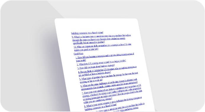 building consensus on a shared vision? 9. What is a business case or anecdotal story that you can share that walk us through the steps you have to go through when conducting strategy specifically for an innovative product? 10. What are important skills or mindsets for a strategist to have? Or what makes you good at your job? Geoff Katz 1. How did you become a strategist and/or get into doing strategy as part of your work? 2. What does UX strategy mean to you? Is it a bogus job title? 3. How did you learn about business strategy? 4. Do you think it’s helpful for UX designers who are aspiring strategists to get an MBA or have a business degree? 5. What types of products have you done the strategy for that were the most exciting or fun to work on? 6. What are the some challenges of conducting strategy in different work environments (for example, startups versus agencies versus enterprises)? 7. Have you ever conducted any form of experiments on your product or UX strategy, whether it be trying to get market validation on a value proposition or testing prototypes on target customers? How do you get closer to the truth while you are conducting strategy? 8. What is your secret weapon or go-to technique for devising strategies or building consensus on a shared vision? 9. What is a business case or anecdotal story that you can share that walks us through the steps you have to go through when conducting strategy specifically for an innovative product? 10. What are important skills or mindsets for a strategist to have? Or what makes you good at your job? 11. Dénouement A. About the Author Index About the Author Colophon Special Upgrade Offer