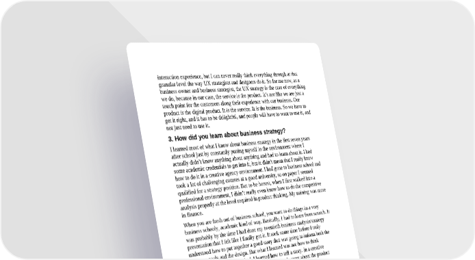 interaction experience, but I can never really think everything through at that granular level the way UX strategists and designers do it. So for me now, as a business owner and business strategist, the UX strategy is the core of everything we do, because in our case, the service is the product. It’s not like we are just a touch point for the customers along their experience with our business. Our product is the digital product. It is the service. It is the business. So we have to get it right, and it has to be delightful, and people will have to want to use it, and not just need to use it. 3. How did you learn about business strategy? I learned most of what I know about business strategy in the first seven years after school just by constantly putting myself in the environment where I actually didn’t know anything about anything and had to learn about it. I had some academic credentials to get into it, but it didn’t mean that I really knew how to do it in a creative agency environment. I had gone to business school and took a lot of challenging courses at a good university, so on paper I seemed qualified for a strategy position. But to be honest, when I first walked into a professional environment, I didn’t really even know how to do the competitive analysis properly at the level required in product thinking. My training was more in finance. When you are fresh out of business school, you want to do things in a very business schooly, academic kind of way. Basically, I had to learn from scratch. It was probably by the time I had done my twentieth business analysis/strategy presentation that I felt like I finally got it. It took some time before I truly understood how to put together a good story that was going to inform both the business goals and the design. But what I learned was not how to think analytically. That I already had. I learned how to tell a story. In a creative business, business strategy has to add up to a simple story about the product opportunity. 4. Do you think it’s helpful for UX designers who are aspiring strategists to get an MBA or have a business degree? No, absolutely not. I think what is required is that they spend time with their colleagues in generative meetings. They really need to learn how to talk to clients and sincerely listen to their business problems. Being a good listener is absolutely essential. So, a degree in psychology might be more helpful than an MBA. I do think it is helpful to take a couple of business classes to learn and