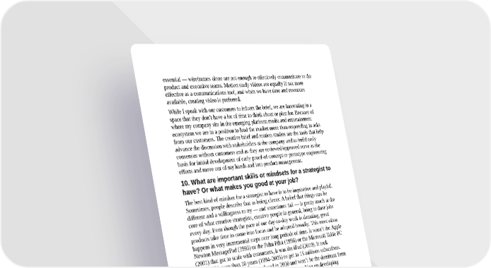essential — wireframes alone are not enough to effectively communicate to the product and executive teams. Motion study videos are equally if not more effective as a communications tool, and when we have time and resources available, creating video is preferred. While I speak with our customers to inform the brief, we are innovating in a space that they don’t have a lot of time to think about or plan for. Because of where my company sits in the emerging platform media and entertainment ecosystem we are in a position to lead the market more than responding to asks from our customers. The creative brief and motion studies are the tools that help advance the discussion with stakeholders at the company and to build early consensus without customers and as they are reviewed/approved serve as the basis for initial development of early proof-of-concept or prototype engineering efforts and move out of my hands and into product management. 10. What are important skills or mindsets for a strategist to have? Or what makes you good at your job? The best kind of mindset for a strategist to have is to be inquisitive and playful. Sometimes, people describe that as being clever. A belief that things can be different and a willingness to try — and sometimes fail — is pretty much at the core of what creative strategists, creative people in general, bring to their jobs every day. Even though the pace of our day-to-day work is daunting, great products take time to come into focus and be adopted broadly. This most often happens in very incremental steps over long periods of time. It wasn’t the Apple Newton MessagePad (1993) or the Palm Pilot (1996) or the Microsoft Table PC (2001) that got to scale with consumers, it was the iPad (2010). It took DIRECTV more than 10 years (1994–2005) to get to 15 millions subscribers. The connected TV was just introduced in 2010 and won’t be the dominant form of television until the end of this decade. I’ve been working on developing “interactive TV” products for consumers since 1994 when I created my first interactive television commercial for Levi’s Youthwear and startup children’s programmer daVinci Time and Space on the Time Warner Full Service Network, and I have no intention of stopping any time soon. So, I’d say having a certain type of patience is as important as having an inquisitive and playful mindset in order to be good at your job. That kind of patience comes from working to get the interactive product design process right, over and over again, every day, as we all work to invent the future together.