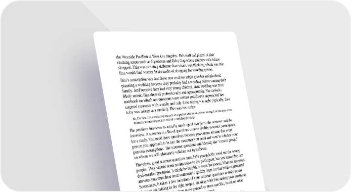 the Westside Pavilion in West Los Angeles. This mall had plenty of kids’ clothing stores such as Gymboree and Baby Gap where mothers with babies shopped. This was certainly different than what I was thinking, which was that Bita would find women in the midst of shopping for wedding gowns. Bita’s assumption was that these new mothers might give her insight about planning a wedding because they probably had a wedding before starting their family. And because they had very young children, their wedding was most likely recent. Bita dressed professionally and appropriately. She carried a notebook on which her questions were written and always approached her targeted customer with a smile and only if the timing was right (typically, their baby was asleep in a stroller). This was her script: Hi, I’m Bita. I’m conducting research on a product idea for an Internet startup. Can you spare a few moments to answer questions related to wedding planning? The problem interview is actually made up of two parts: the screener and the interview. A screener is a list of questions used to qualify potential participants for a study. You need these questions because you cannot assume that every person you approach is in fact the customer you need and want to validate your persona assumptions. The screener questions will identify the “control group,” on whom we will ultimately validate our hypotheses. Therefore, good screener questions must help you quickly weed out the wrong people. They should seem nonintrusive to the participant, but you know they are deal-breaker questions. It might be helpful to work backward. What are the exact answers you must hear from someone to qualify them for this mini-experiment? Sometimes, it takes a few iterations of your screener questions to truly ensure that you are talking to the right people. Be okay with fine-tuning your questions on the fly to either make them more general or more specific, based on what happens “in the wild” as you begin talking to people. Let’s get back to Bita. If the woman she confronted seemed open to chatting, Bita immediately launched into her screener questions. Phase 1: The screener questions 1. Were you married within the last few years? Yes (continue to question 2) No (kindly end the interview) 2. Did you happen to get married here in Los Angeles? Yes (interview the person)