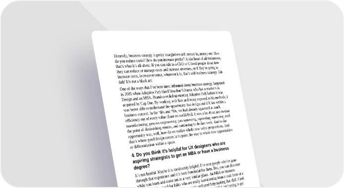 Honestly, business strategy is pretty straightforward: money in, money out. How do you reduce costs? How do you increase profits? At the heart of all businesses, that’s what it’s all about. If you can talk to a CEO or C-level people about how they can reduce or manage costs and increase revenues, or if they’re going to increase costs, increase revenue, whatever it is, that’s still business strategy. Tah dah! It’s not a black art. One of the ways that I’ve been most informed about business strategy happened in 2005 when Adaptive Path hired Brandon Schauer, who has a master’s in Design and an MBA. Brandon ended up running Adaptive Path before it was acquired by Cap One. By working with him and being exposed to his methods, I was better able to understand the opportunity that design and UX has within a business context. In the ‘80s and ‘90s, we had already squeezed as much efficiency out of every value chain we could find. It was a lot about just-in-time manufacturing, process engineering; just squeezing, squeezing, squeezing, until the point of diminishing returns, and continuing to do that work. And so the opportunity was, well, how do we realize whole new value propositions. And that’s where good design comes in to point the way to whole new opportunities or differentiation within a space. 4. Do you think it’s helpful for UX designers who are aspiring strategists to get an MBA or have a business degree? It’s not hurtful. Maybe it is moderately helpful. I’ve seen people who’ve gone through that experience and it’s been beneficial for them. But, you can also earn while you learn and come out in a very similar place. An MBA or business degree could be good for folks who are really transitioning from a craft form of a UX practice into something more strategic and need help making that shift. I feel like if you’re already doing it, even if it’s self-taught, an MBA isn’t going to get you much more. It could be useful depending on the school for making connections and meeting new people. Having a Harvard MBA or Stanford GSB certainly is not going to look bad on your resume. But that type of education is going to be a big financial investment too. 5. What types of products have you done the strategy for that were most exciting or fun to work on? A transformative experience for me was working with Brandon Schauer at Adaptive Path on a project for a financial services client (not Capital One). It was in 2005, just when he joined our company. This project was meant to be a