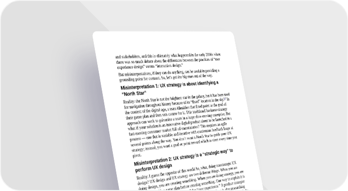 and stakeholders, and this is ultimately what happened in the early 2000s when there was so much debate about the differences between the practices of “user experience design” versus “interaction design.” But misinterpretations, if they can do anything, can be useful in providing a grounding point for contrast. So, let’s get the big ones out of the way. Misinterpretation 1: UX strategy is about identifying a “North Star” Reality: the North Star is not the brightest star in the galaxy, but it has been used [4] for navigation throughout history because of its “fixed” location in the sky. In the context of the digital age, a team identifies that fixed point as the goal of their game plan and then sets course for it. This traditional business-strategy approach can work to galvanize a team in a large slow-moving enterprise. But what if your solution is an innovative digital product about to be launched in a fast-moving consumer market full of uncertainties? This requires an agile process — one that is variable and iterative with continuous feedback loops at several points along the way. You don’t want a North Star to guide your UX strategy; instead, you want a goal or point toward which to steer every time you pivot. Misinterpretation 2: UX strategy is a “strategic way” to perform UX design Reality: I guess the opposite of this would be, what, doing nonstrategic UX design? UX design and UX strategy are two different things. When you are doing design, you are creating something. When you are doing strategy, you are coming up with a game plan before creating something. One way to explain it is to just substitute the word “product” for “user experience.” A product strategist thinks about all the possibilities for the product and defines it after researching the potential customers and existing competitors. She thinks about how much the product will cost to make and be priced to sell at, and how it will be distributed to different customer segments. In contrast, a product designer actually fabricates the thing. They are two separate disciplines. Too often, I have seen UX designers work on products without being informed of the overall business strategy. They are blind beyond what they’ve received in the business requirements document. This disconnect is why the Lean UX movement is so popular; it advocates that UX designers take on a bigger leadership role (“getting a seat at the strategy table”) by becoming the glue that holds cross-functional teams together.