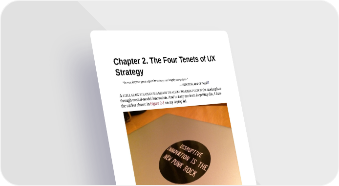 Chapter 2. The Four Tenets of UX Strategy “In war, let your great object be victory, not lengthy campaigns.” [7] — SUN TZU, ART OF WAR A STELLAR UX STRATEGY IS A MEANS TO ACHIEVING DISRUPTION IN the marketplace through mental-model innovation. And to keep me from forgetting this, I have the sticker shown in Figure 2-1 on my laptop lid. Figure 2-1. The sticker on my laptop lid Because what’s the point in spending time and energy crafting a digital product that isn’t unique? Or, at the very least, is a much better alternative to current solutions found in the online marketplace? To achieve that disruption, we need a framework in which to connect all the dots