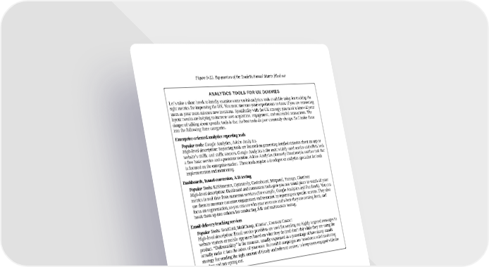Figure 9-15. Top portion of the TradeYa Funnel Matrix filled out ANALYTICS TOOLS FOR UX DUMMIES Let’s take a short break to briefly examine some useful analytics tools available today for tracking the right metrics for improving the UX. You must measure your experiments to know if you are converting users as your team releases new iterations. Specifically with the UX strategy, you need to know if your layout tweaks are helping to increase user acquisition, engagement, and successful transactions. The danger of talking about specific tools is that the best tools du jour constantly change. So I broke them into the following three categories. Enterprise-oriented analytics reporting tools Popular tools: Google Analytics, Adobe Analytics High-level description: Reporting tools are focused on generating detailed statistics about an app or website’s traffic and traffic sources. Google Analytics is the most widely used service and offers both a free basic service and a premium version. Adobe Analytics (formerly Omniture) is another tool that is focused on the enterprise market. These tools require a developer or analytics specialist for both implementation and monitoring. Dashboards, funnel conversion, A/B testing Popular Tools: KISSmetrics, Optimizely, Geckoboard, Mixpanel, Totango, Chartbeat High-level description: Dashboard and conversion tools give you one visual place to watch all your metrics in real time from numerous services (for example, Google Analytics and Facebook). You can use them to measure customer engagement and retention by reporting on specific actions. They also focus on segmentation, so you can see who your users are and where they are coming from, and break them up into cohorts for conducting A/B and multivariate testing. Email delivery/tracking services Popular Tools: SendGrid, MailChimp, iContact, Constant Contact High-level description: Email service providers are used for sending out highly targeted messages to website visitors or mobile app users based on what they do (and don’t do) while they are using the product. “Deliverability” is the measure, usually expressed as a percentage of how many emails actually make it into the inbox of your user. Successful campaigns are based on a solid marketing strategy for sending the right amount of timely and relevant content to keep users engaged with the product and not opting out.