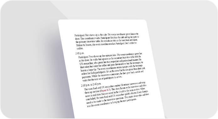 Participant One shows up at the cafe. The event coordinator greets him at the door. The coordinator walks Participant One into the café and up the stairs to the primary interview table. He introduces him to the team lead and client. Before he leaves, the event coordinator takes Participant One’s order for coffee. 2:05 p.m. Participant Two shows up five minutes late. The event coordinator greets her at the door. He walks her upstairs to the secondary interview table with the UX researcher, who greets her in a respectful and professional manner. He then takes her order for coffee and goes downstairs to buy the beverages; he leaves a large tip. The event coordinator returns upstairs with the beverage orders for both participants. It’s at this time that he also gives them their cash payments. While the interviews commence, he then goes back outside and waits for the next set of participants to arrive. 2:10 p.m. to 2:45 p.m. The team lead and UX researcher conduct 30-minute interviews and wrap them up on time (Figure 8-2). The client listens to the interviews and takes notes in real time that are saved in the cloud for the team to view. When concluded, the team lead and UX researcher quickly discuss if any changes need to be made to the interview questions. They make those edits and then text the event coordinator to bring up the next participants.