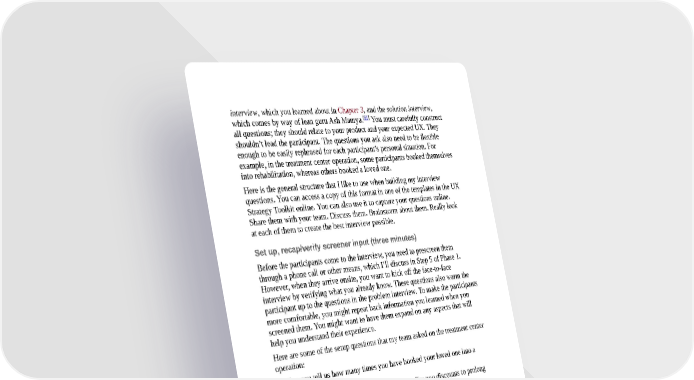 interview, which you learned about in Chapter 3, and the solution interview, [61] which comes by way of lean guru Ash Maurya. You must carefully construct all questions; they should relate to your product and your expected UX. They shouldn’t lead the participant. The questions you ask also need to be flexible enough to be easily rephrased for each participant’s personal situation. For example, in the treatment center operation, some participants booked themselves into rehabilitation, whereas others booked a loved one. Here is the general structure that I like to use when building my interview questions. You can access a copy of this format in one of the templates in the UX Strategy Toolkit online. You can also use it to capture your questions online. Share them with your team. Discuss them. Brainstorm about them. Really look at each of them to create the best interview possible. Set up, recap/verify screener input (three minutes) Before the participants come to the interview, you need to prescreen them through a phone call or other means, which I’ll discuss in Step 5 of Phase 1. However, when they arrive onsite, you want to kick off the face-to-face interview by verifying what you already know. These questions also warm the participant up to the questions in the problem interview. To make the participants more comfortable, you might repeat back information you learned when you screened them. You might want to have them expand on any aspects that will help you understand their experience. Here are some of the setup questions that my team asked on the treatment center operation: Can you tell us how many times you have booked your loved one into a rehabilitation center? How long was each stay and did the facility offer you discounts to prolong the stay? How did you find out about individual rehabilitation centers (word-of-mouth recommendation, the Internet, a list provided by a specialist, and so on)? If you used the Internet, how did you find the facilities (for instance, Google), and which sites did you use for finding them and learning about the specific details? Notice how the questions would seem nonintrusive to the participants. They aren’t shocked by them, because they know (based on the advertisement and screener questions) that that’s why they’re here. However, the questions have a second purpose, and that is to set up the context for the next part of the