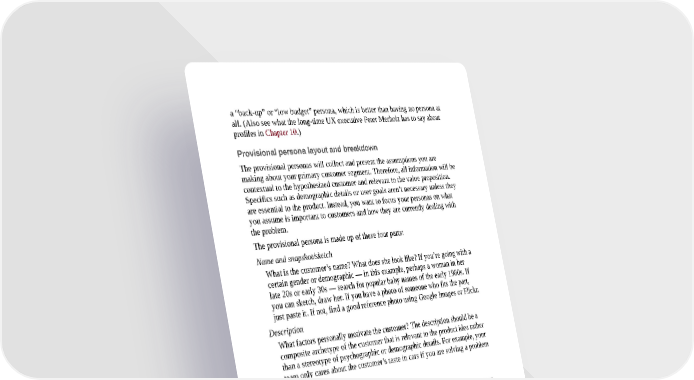 a “back-up” or “low budget” persona, which is better than having no persona at all. (Also see what the long-time UX executive Peter Merholz has to say about profiles in Chapter 10.) Provisional persona layout and breakdown The provisional personas will collect and present the assumptions you are making about your primary customer segment. Therefore, all information will be contextual to the hypothesized customer and relevant to the value proposition. Specifics such as demographic details or user goals aren’t necessary unless they are essential to the product. Instead, you want to focus your personas on what you assume is important to customers and how they are currently dealing with the problem. The provisional persona is made up of these four parts: Name and snapshot/sketch What is the customer’s name? What does she look like? If you’re going with a certain gender or demographic — in this example, perhaps a woman in her late 20s or early 30s — search for popular baby names of the early 1980s. If you can sketch, draw her. If you have a photo of someone who fits the part, just paste it. If not, find a good reference photo using Google Images or Flickr. Description What factors personally motivate the customer? The description should be a composite archetype of the customer that is relevant to the product idea rather than a stereotype of psychographic or demographic details. For example, your team only cares about the customer’s taste in cars if you are solving a problem related to cars. Behaviors This category can be answered in several ways. The first is how the customer is trying to solve the problem now. Is it via a workaround on the Internet? In the real world or a hybrid of both? Is the customer tech-savvy enough to use the Internet to solve his problem? Is he using social networks to do it? Or are there general behaviors for customers who are using similar types of digital products that are relevant to your solution? The second is how the person’s personality affects his behavior. For example, if the person is professionally successful, does that make him a good problem solver? Is the customer trusting or skeptical? Needs and goals