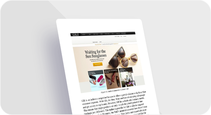 Figure 4-5. Indirect competitor’s website: Gilt Gilt is an indirect competitor because it offers a partial solution to the Busy Man customer segment. With Gilt, the Busy Man could avoid annoying salespeople and get access to top brands. However, Gilt has a flash sales business model. That means that single products are only on sale for a brief period of time (perhaps just 24 hours). This makes it possible for Gilt to offer its targeted customer base deep discounts, but Paul’s intended customer base doesn’t want that at the expense of flexibility and time. Time limits and curated selections would actually prevent Paul’s intended customers from putting together the personalized wardrobe of their dreams. So, although customers of the Busy Man could solve some of their big fashion needs with Gilt, it wouldn’t be the their ideal solution. But no matter, whether the competition is direct or indirect, the Internet is an intense marketplace. Make sure that you consider all of your competitors because they will affect the overall success of your product. The reality is that people often use products or combinations of products in ways that the product makers do not expect. (Remember what Ena discovered about hosts for wedding venues on Airbnb!) Research everything because that is how you and your team will ensure that you have an edge over others in your industry.