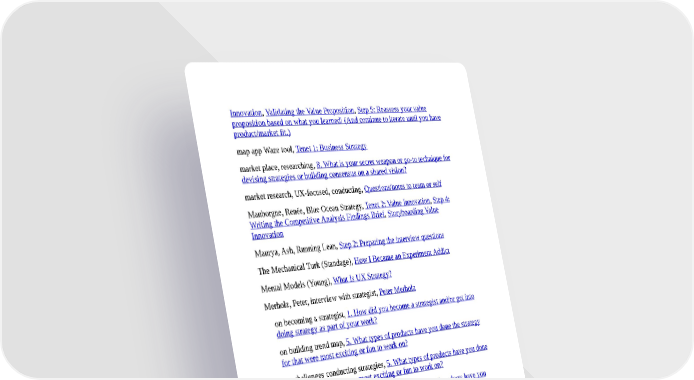 Innovation, Validating the Value Proposition, Step 5: Reassess your value proposition based on what you learned! (And continue to iterate until you have product/market fit.) map app Waze tool, Tenet 1: Business Strategy market place, researching, 8. What is your secret weapon or go-to technique for devising strategies or building consensus on a shared vision? market research, UX-focused, conducting, Questions/notes to team or self Mauborgne, Renée, Blue Ocean Strategy, Tenet 2: Value Innovation, Step 4: Writing the Competitive Analysis Findings Brief, Storyboarding Value Innovation Maurya, Ash, Running Lean, Step 2: Preparing the interview questions The Mechanical Turk (Standage), How I Became an Experiment Addict Mental Models (Young), What Is UX Strategy? Merholz, Peter, interview with strategist, Peter Merholz on becoming a strategist, 1. How did you become a strategist and/or get into doing strategy as part of your work? on building trend map, 5. What types of products have you done the strategy for that were most exciting or fun to work on? on challenges conducting strategies, 5. What types of products have you done the strategy for that were most exciting or fun to work on? on challenges of conducting strategies, 5. What types of products have you done the strategy for that were most exciting or fun to work on? on ecommerce platform project, 7. Have you ever conducted any form of experiments on your product or UX strategy, whether it be trying to get market validation on a value proposition or testing prototypes on target customers? How do you get closer to the truth while you are conducting strategy? on education of strategists, 3. How did you learn about business strategy? on learning about business strategy, 2. What does UX strategy mean to you? Is