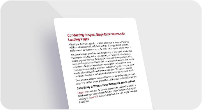 Conducting Suspect Stage Experiments with Landing Pages What if you don’t have a product or MVP at this stage in the game? Well, you still have a funnel to work with, but it will just all be hypothetical. You can’t really connect any metrics to any of the levels yet, except for one: the Suspect. You can potentially growth-hack the Suspect stage of your funnel with Landing Page experiments. But, before I get into that, let’s begin with a few basics. A landing page is a web page that is not the home page of your product. Landing pages are designed to specifically elicit one key action from users. They are also sometimes called lead capture pages, squeeze pages, and destination pages. Users are driven to landing pages from multiple touch points — organic search results, advertising, and social network campaigns. The pages are basically specifically designed to suck potential customers into the top of your funnel. There are many different ways in which you can use landing pages on unwary suspects to validate a value proposition. I will use case studies to illustrate how. Case Study 1: When a Value Proposition Needs to Pivot Chapter 8 recounts how the software engineer who conceived the idea for a Hotels.com-type website for rehabilitation centers found himself in a pretty tough spot. Figure 9-16 shows what the Book Your Care original home page looked like.