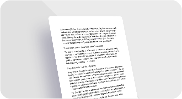 [44] Adventures of Prince Achmed, in 1926. Since then, they have become versatile tools used for advertising campaigns, comics, motion pictures, software design, and various other business processes. The reason is that a storyboard promotes visual thinking. Or, as the authors of the book Game Storming: A Playbook for [45] Innovators, Rulebreakers, and Changemakers, write, “[It is a] visioning exercise [that] allows participants to imagine and create possibilities.” Three steps to storyboarding value innovation The goal of a storyboard is to tell the story of your key experience(s) visually. You want to use the format to zero in on the most important components of the experience. Say more with less, and finish with a happy ending in that the problem for your user is solved. Here is my recommended framework for building (and presenting) a storyboard: Step 1: Create your list of panels. Keep in mind that you do not want to demonstrate all the features of the product (as Ena incorrectly did when she first mapped out her key experiences). You are only showing the most “valuable” moments of your customer’s journey through the storyboard panels. Some of these moments will impact the interface design, and other moments will actually occur offline. Show the progression of the entire experience regardless of whether the experience takes 20 minutes (such as Uber) or two months (Airbnb) in real time. For Bita and Ena, this meant showing how their bride-to-be experienced her dream wedding coming true rather than showing how account registration on Airbnb for Weddings works. Here are the panels they stitched together: 1. Bride-to-be is looking for a beautiful and affordable venue online. 2. She finds a result set of two to three listings. 3. She sees a detail view of an awesome listing. 4. She selects a package (venue, food, flowers). 5. She receives a confirmation of venue/tour/submission. 6. She gets married on the beach! Step 2: Decide on your visual format (digital montages versus sketching on paper). Some people know how to draw or sketch. Others (like me) cannot even draw a meaningful stick figure. What matters the most is that you choose a format that is fast and easy for you and your team to pull your storyboard together. If you