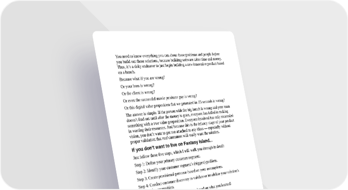 You need to know everything you can about those problems and people before you build out those solutions, because building software takes time and money. Thus, it’s a risky endeavor to just begin building a new innovative product based on a hunch. Because what if you are wrong? Or your boss is wrong? Or the client is wrong? Or even the successful movie producer guy is wrong? Or this digital value proposition that we generated in .05 seconds is wrong? The answer is simple. If the person with the big hunch is wrong and your team doesn’t find out until after the money is gone, everyone has failed in making something with a true value proposition. Everyone involved has only succeeded in wasting their resources. And because this is the infancy stage of your product vision, you don’t want to get too attached to any ideas — especially without proper validation that real customers will really want the solution. If you don’t want to live on Fantasy Island... Just follow these five steps, which I will walk you through in detail: Step 1: Define your primary customer segment. Step 2: Identify your customer segment’s (biggest) problem. Step 3: Create provisional personas based on your assumptions. Step 4: Conduct customer discovery to validate or invalidate your solution’s initial value proposition. Step 5: Reassess your value proposition based on what you learned! (Rinse and repeat until you have product/solution fit.) It’s that easy! We just need to be empirical in our process. Step 1: Define your primary customer segment Because you and your team are launching an innovative product, you are starting with zero customers. Therefore, if you think your customer is everybody, think harder. Otherwise, you’re facing an uphill battle in customer acquisition. Which is easier: getting everybody to use your app, or getting people who really need it to sign up? Many hit digital products have done just that. When Facebook launched, it was exclusive to students at Harvard University, not the entire