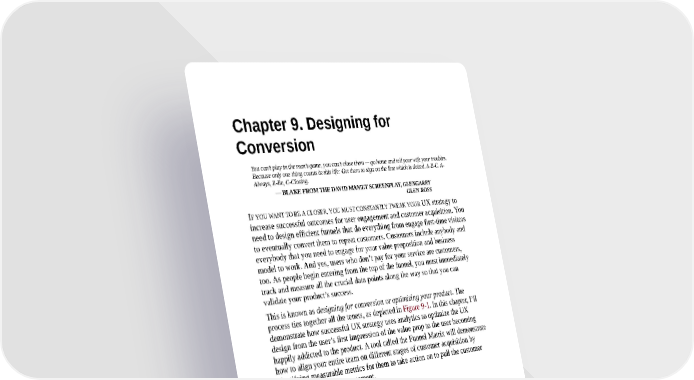 Chapter 9. Designing for Conversion You can’t play in the man’s game, you can’t close them — go home and tell your wife your troubles. Because only one thing counts in this life: Get them to sign on the line which is dotted. A-B-C. A- Always, B-Be, C-Closing. — BLAKE FROM THE DAVID MAMET SCREENPLAY, GLENGARRY GLEN ROSS IF YOU WANT TO BE A CLOSER, YOU MUST CONSTANTLY TWEAK YOUR UX strategy to increase successful outcomes for user engagement and customer acquisition. You need to design efficient funnels that do everything from engage first-time visitors to eventually convert them to repeat customers. Customers include anybody and everybody that you need to engage for your value proposition and business model to work. And yes, users who don’t pay for your service are customers, too. As people begin entering from the top of the funnel, you must immediately track and measure all the crucial data points along the way so that you can validate your product’s success. This is known as designing for conversion or optimizing your product. The process ties together all the tenets, as depicted in Figure 9-1. In this chapter, I’ll demonstrate how successful UX strategy uses analytics to optimize the UX design from the user’s first impression of the value prop to the user becoming happily addicted to the product. A tool called the Funnel Matrix will demonstrate how to align your entire team on different stages of customer acquisition by identifying measurable metrics for them to take action on to pull the customer into a deeper level of engagement.